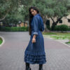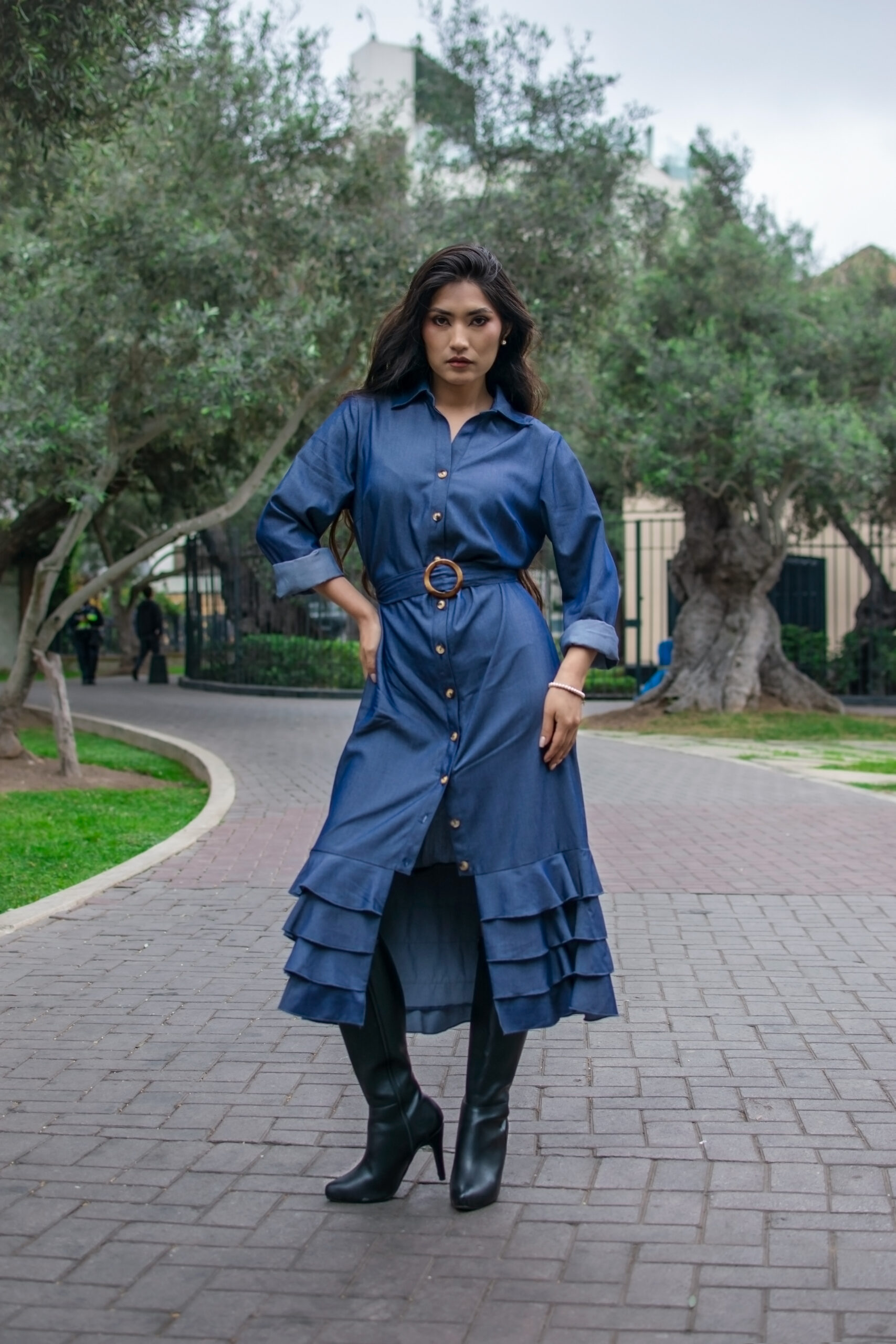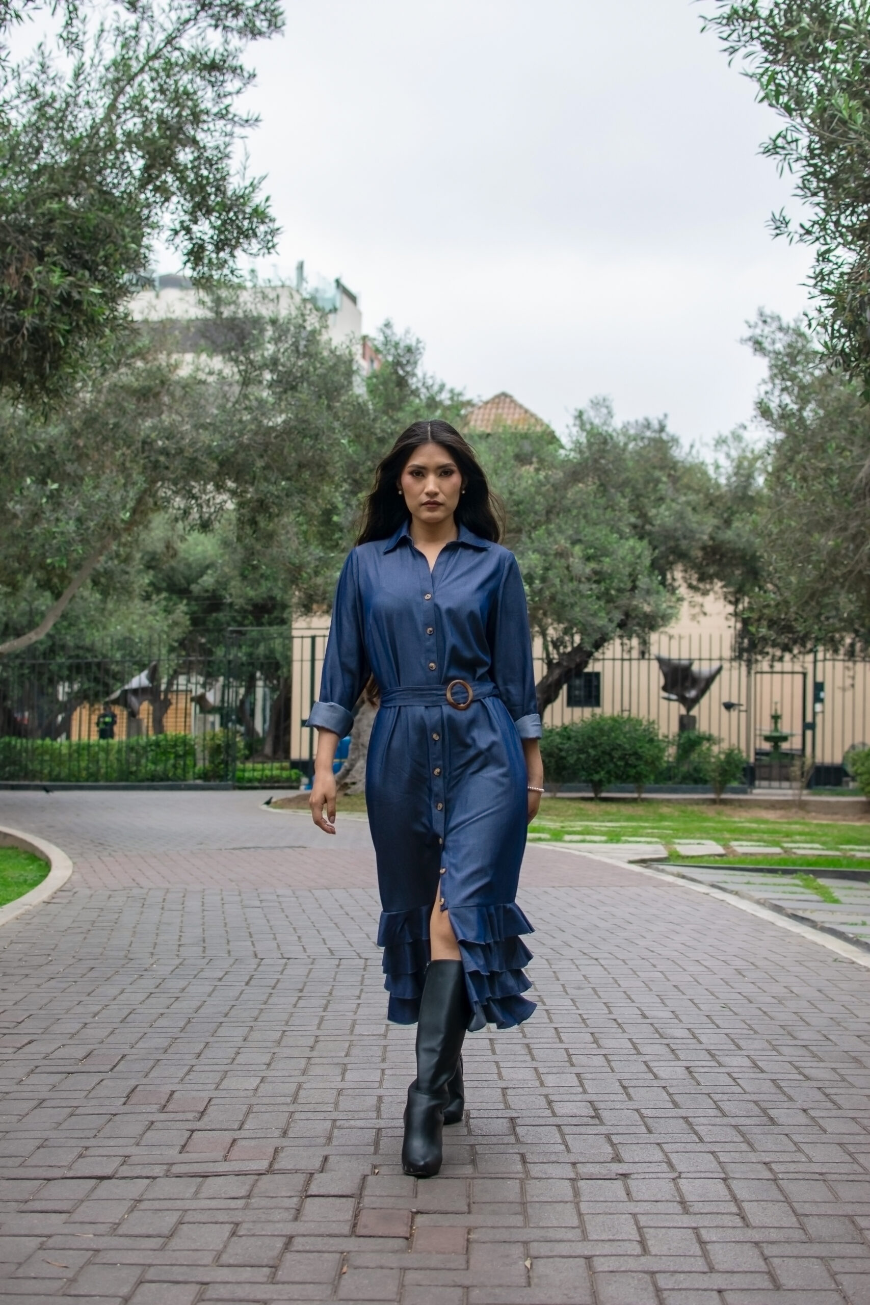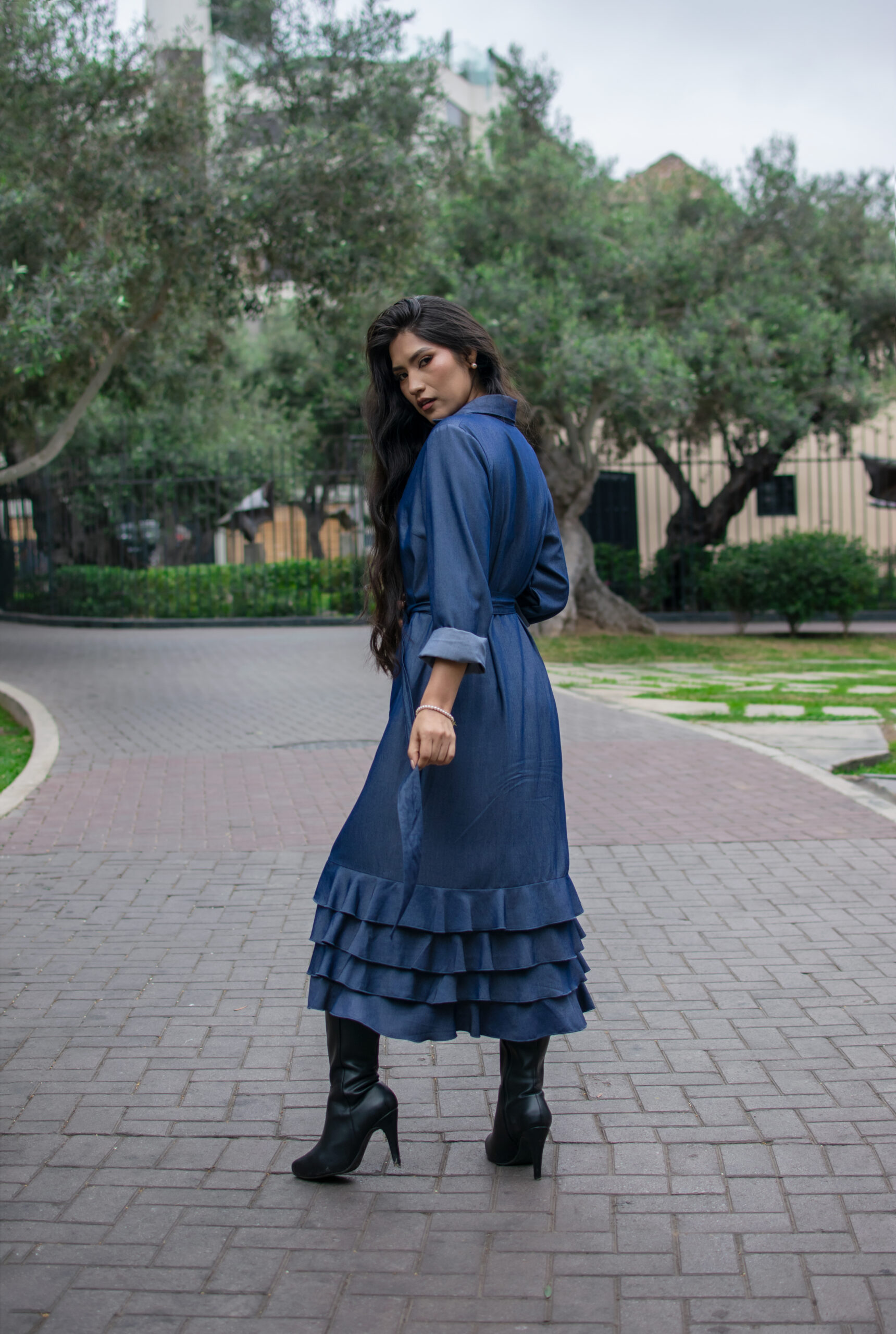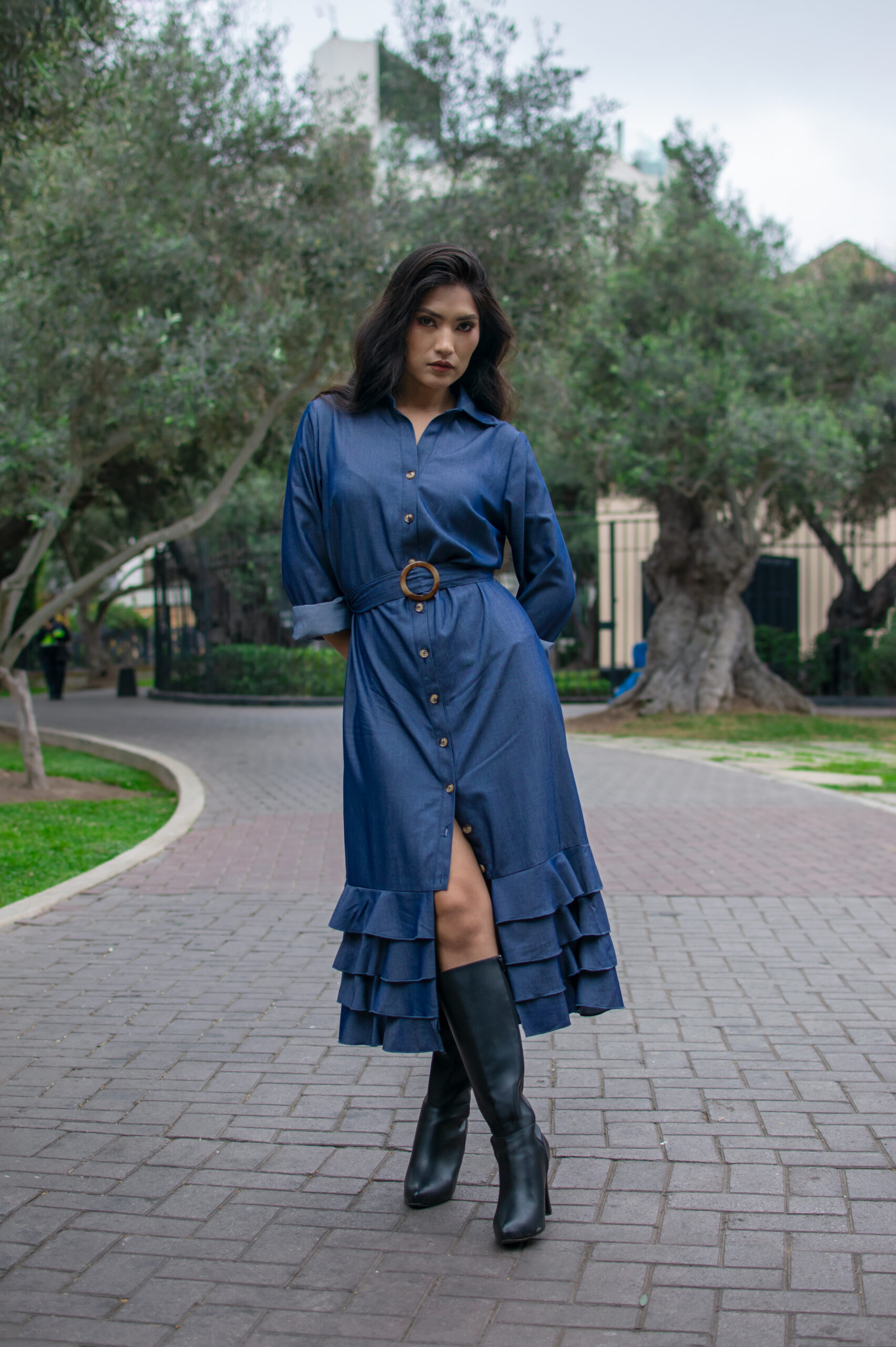 Vestido camisero con botones y volantes en el bajo. Sofisticado y moderno, ideal para el día a día.